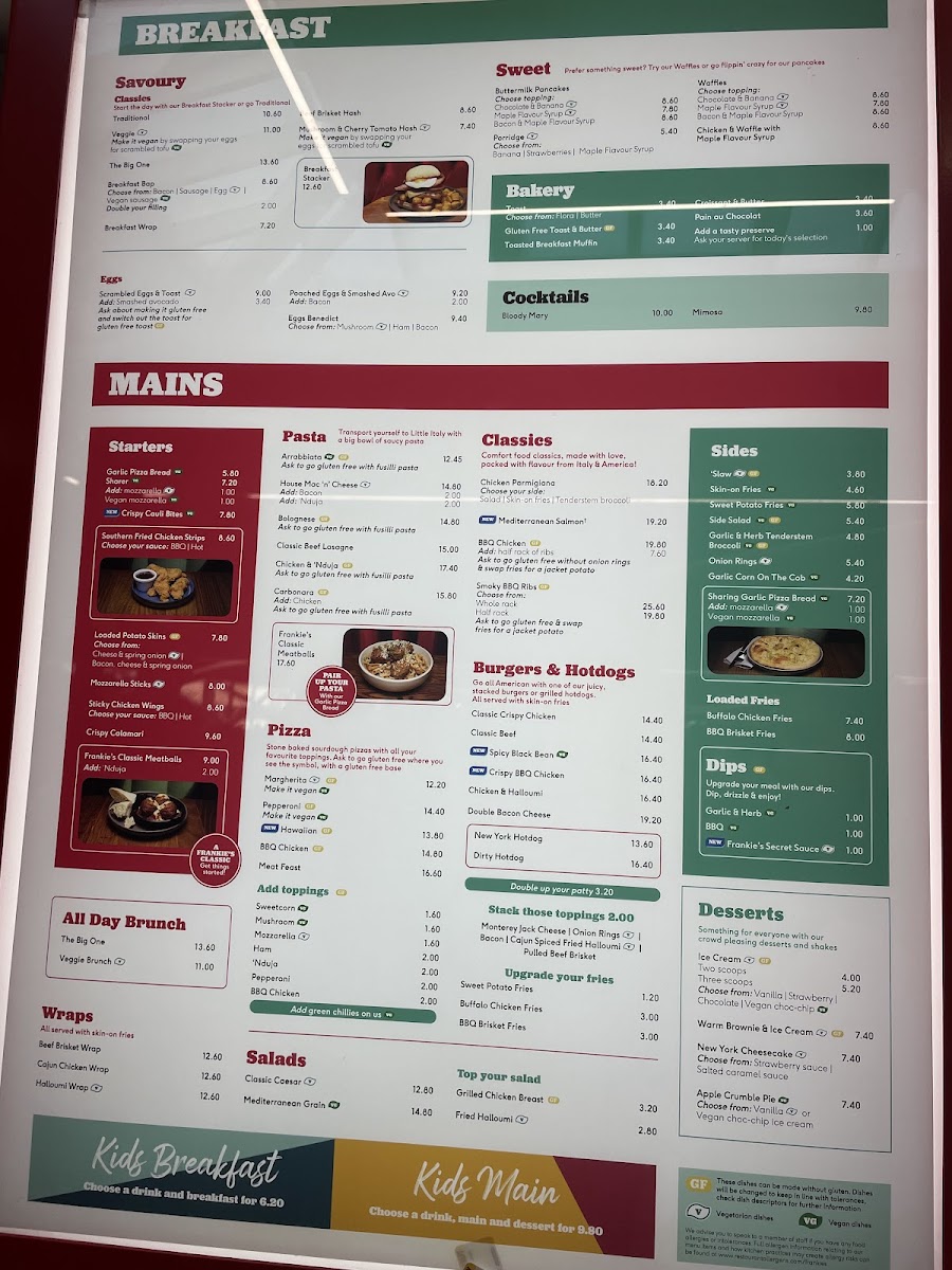 In conclusion, Frankie & Benny’s - Bristol Airport Menu offers a comforting, crowd-pleasing meal before takeoff. The mix of American diner classics and Italian favourites caters to most palates, and its consistent performance makes it a trustworthy dining choice. For those seeking a familiar, satisfying bite amidst the chaos of travel, this location hits the mark.